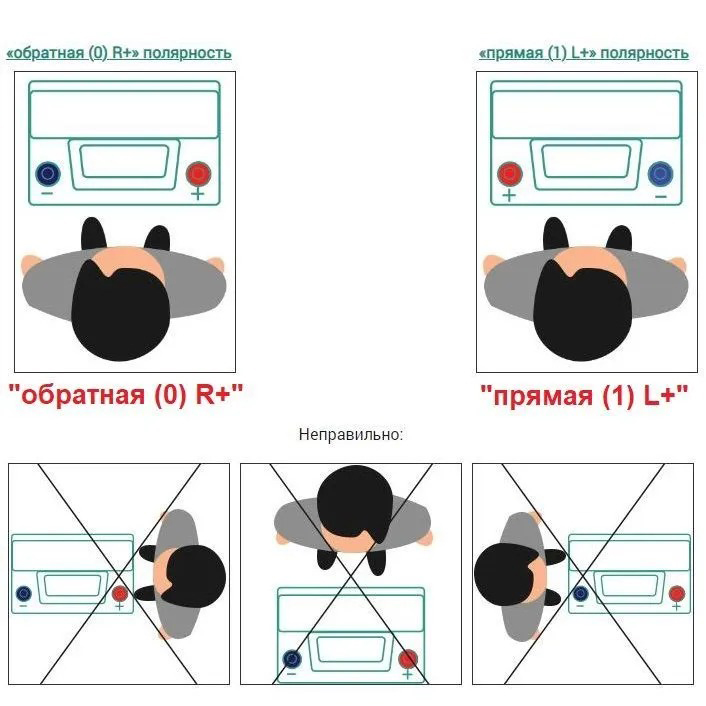 - если положительная клемма (токовывод) аккумулятора (рядом с ней на крышке аккумулятора должен быть нарисован "+") находится справа, то у аккумулятора полярность "0" ("обратная" или "европейская");